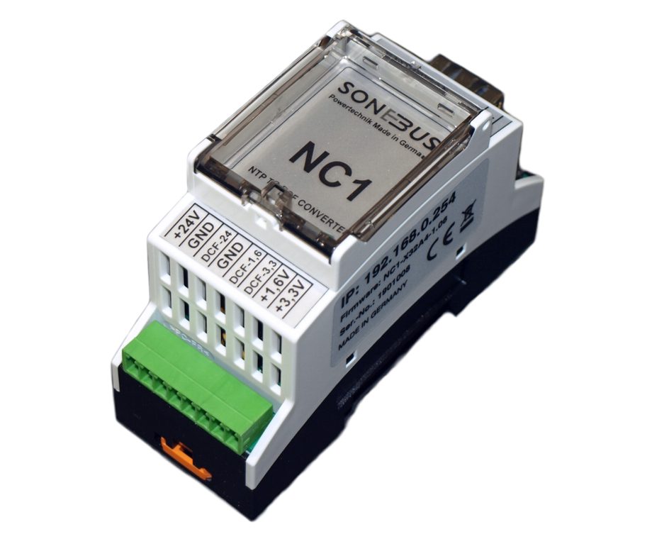 Der Sonebus NC1 NTP-Konverter holt sich zyklisch SNTP-Zeitinformationen aus dem Intra- oder Internet und stellt diese als stabiles DCF-Signal Hauptuhren oder DCF-Uhrwerken zur Verfügung. Der NC1 besitzt einen Real Time Clock Generator, der mit einem wartungsfreien Goldcap gestützt wird. Deshalb läuft bei Spannungsausfall die interne Zeit noch etwa 14 Tage weiter. Alle Einstellungen werden im EEPROM abgelegt und bleiben dauerhaft erhalten.